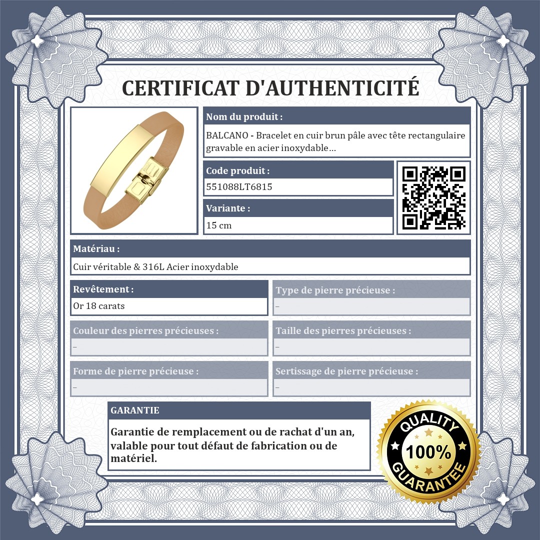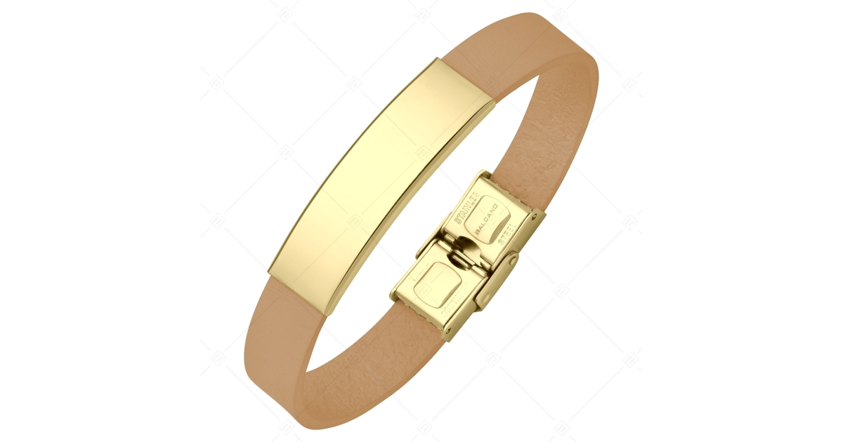 BALCANO - Bracelet en cuir brun pâle avec tête rectangulaire gravable en acier inoxydable plaqué or 18K