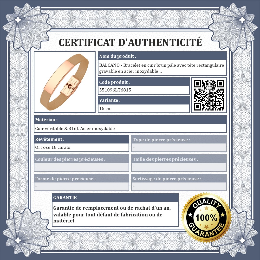 BALCANO - Bracelet en cuir brun pâle avec tête rectangulaire gravable en acier inoxydable plaqué or rose 18K