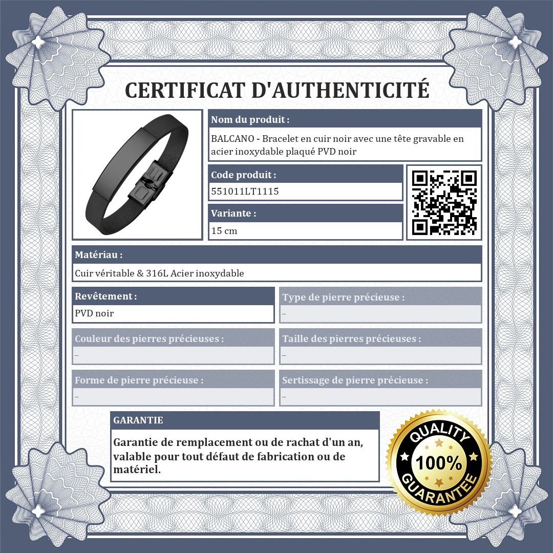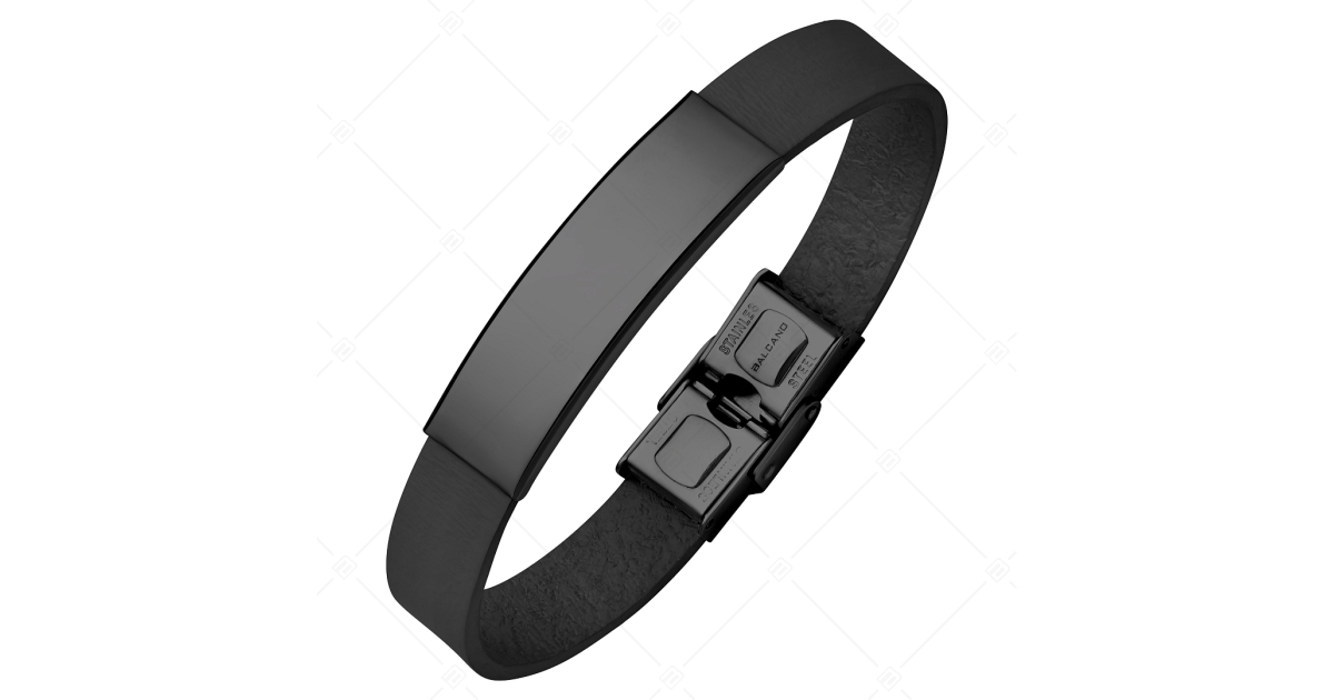 BALCANO - Bracelet en cuir noir avec une tête gravable en acier inoxydable plaqué PVD noir