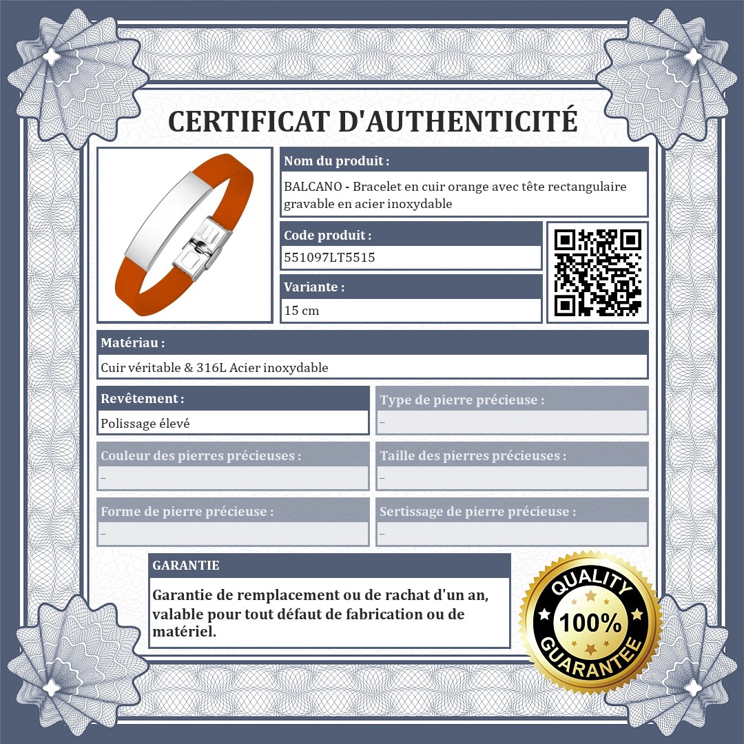 BALCANO - Bracelet en cuir orange avec tête rectangulaire gravable en acier inoxydable