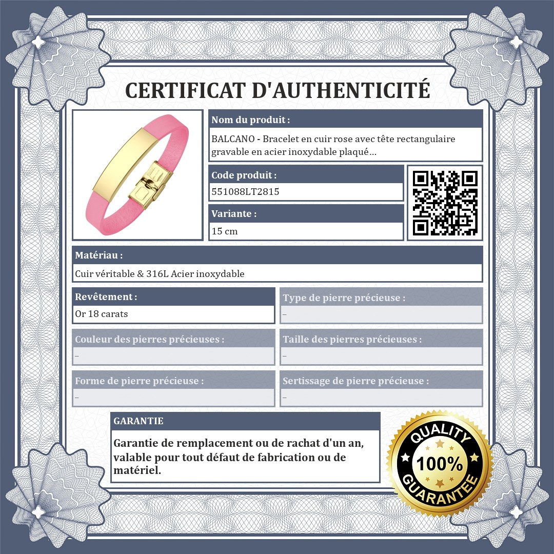 BALCANO - Bracelet en cuir rose avec tête rectangulaire gravable en acier inoxydable plaqué or 18K