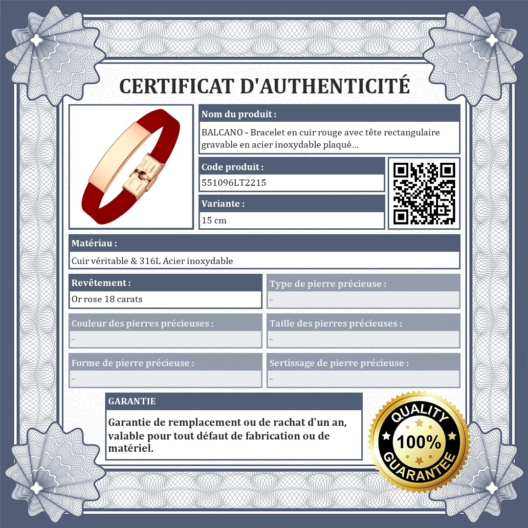 BALCANO - Bracelet en cuir rouge avec tête rectangulaire gravable en acier inoxydable plaqué or rose 18K