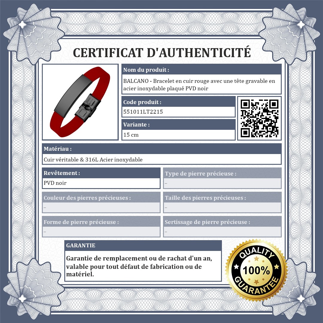 BALCANO - Bracelet en cuir rouge avec une tête gravable en acier inoxydable plaqué PVD noir