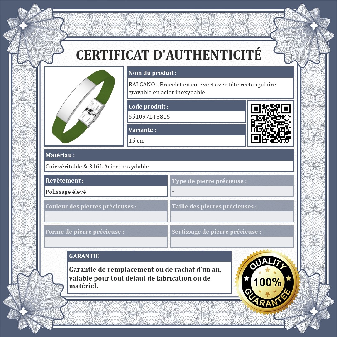 BALCANO - Bracelet en cuir vert avec tête rectangulaire gravable en acier inoxydable
