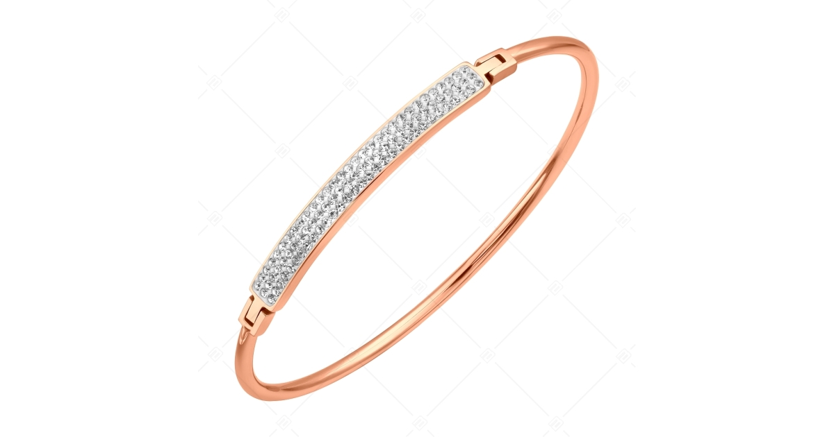 Bracelet en acier inoxydable de forme ovale avec tête ouvrable sertie de cristaux tchèques magnifiquement étincelants. Le bracelet est fabriqué en acier inoxydable 316L antiallergique de qualité médicale, hautement poli et plaqué or rose 18K.