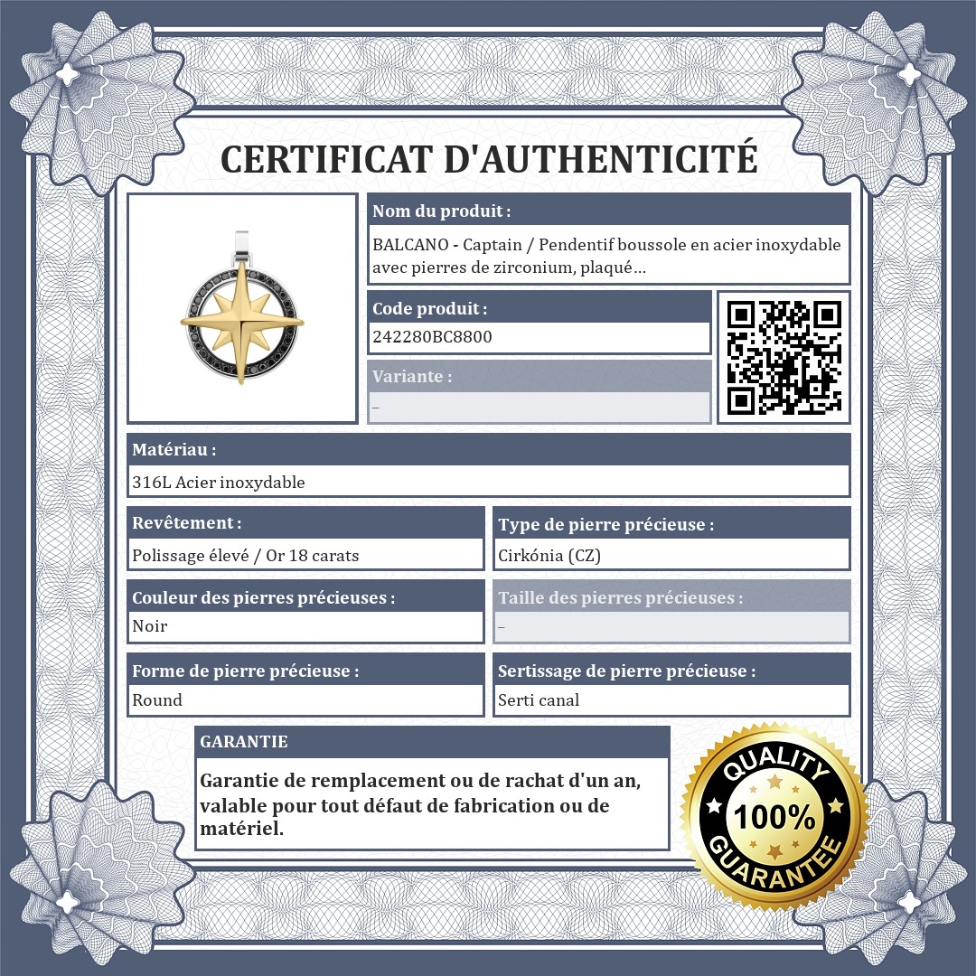 BALCANO - Captain / Pendentif boussole en acier inoxydable avec pierres de zirconium, plaqué or 18K