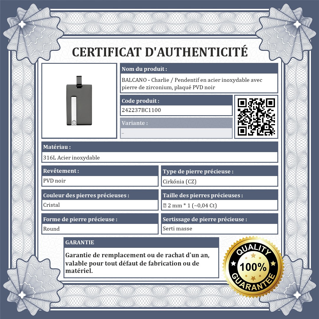 BALCANO - Charlie / Pendentif en acier inoxydable avec pierre de zirconium, plaqué PVD noir