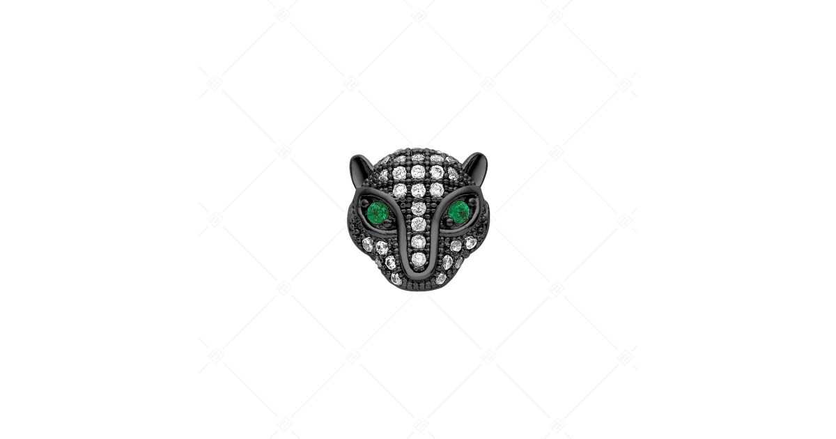 Charm spacer en cuivre en forme de tête de guépard. Accessoire à la mode serti de pierres de zirconium cubique vertes et claires, avec plaqué en PVD noir chromé.
