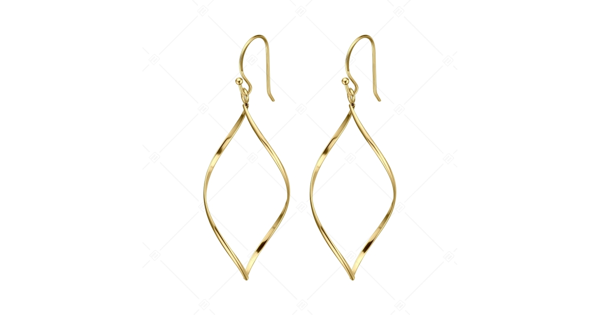 Magnifiques boucles d'oreilles pendantes légèrement torsadées et incurvées en acier inoxydable 316L, plaqué or 18K. Bijoux hypoallergéniques que tout le monde peut porter en toute sécurité. Grâce à son matériau, il ne se décolore pas, ne s'use pas et n'est pas sensible à l'eau minérale ou aux produits de nettoyage. Unique et élégant pour toutes les occasions.
