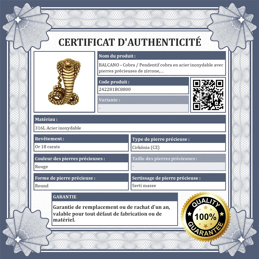 Le matériau est hypoallergénique, non abrasif et non corrosif. Les yeux du cobra sont faits de pierres précieuses en zirconium rouge.