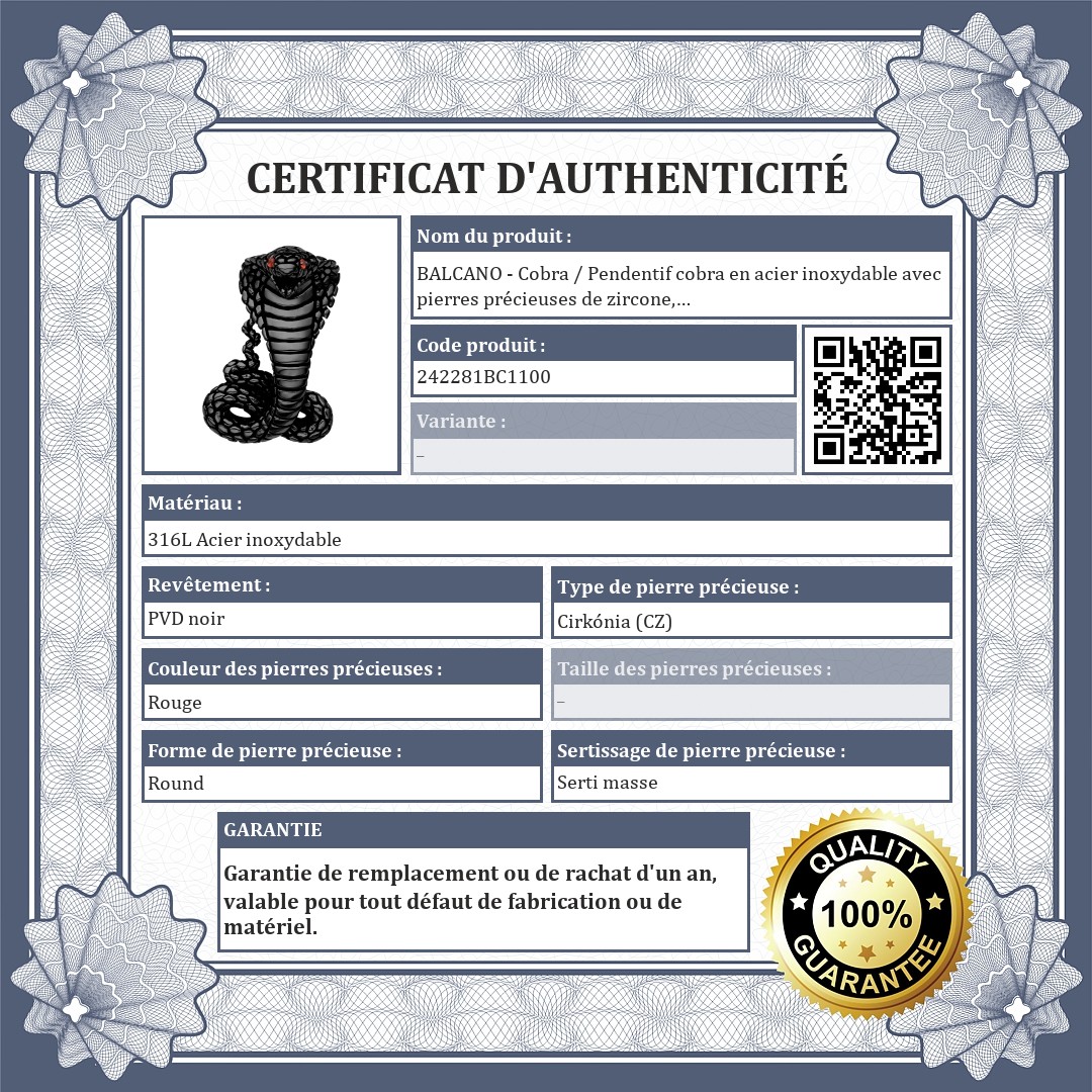Le matériau est hypoallergénique, non abrasif et non corrosif. Les yeux du cobra sont faits de pierres précieuses en zirconium rouge.