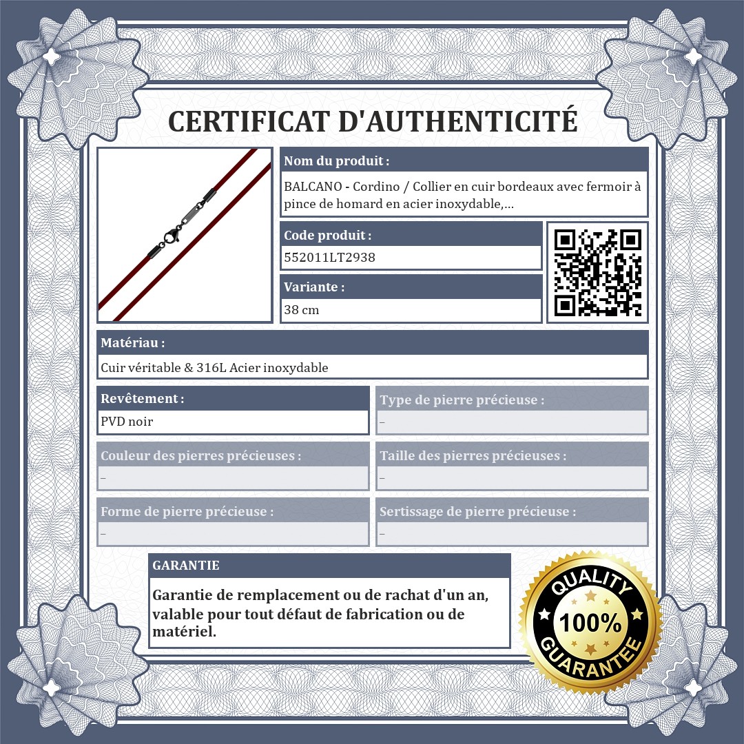 BALCANO - Cordino / Collier en cuir bordeaux avec fermoir à pince de homard en acier inoxydable, plaqué PVD noir - 2 mm