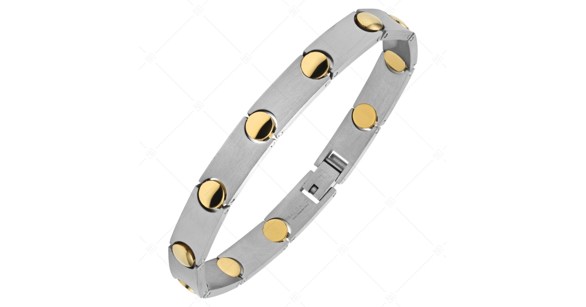 Tiré sur un fil, bracelet rigide avec une finition mate, des maillons rectangulaires rigides avec une décoration circulaire plaqué or 18K entre les maillons. Bijoux en acier inoxydable de qualité médicale 316L, antiallergique, avec fermoir sécurisé à boucle déployante.
