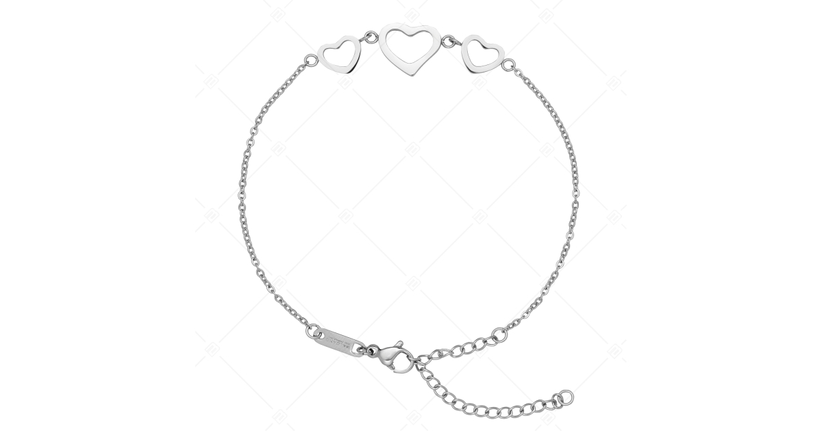 Bracelet de cheville type ancre aplatie avec trois coeurs. Bijoux en acier inoxydable de qualité médicale 316L avec hautement polie. Un accessoire à la mode et élégant, qui, grâce à son matériau hypoallergénique, ne s'use pas et ne se ternit pas à l'usage.
