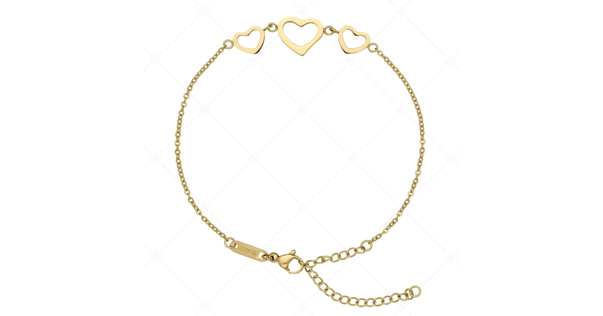 Bracelet de cheville type ancre aplatie avec trois coeurs. Bijoux en acier inoxydable de qualité médicale 316L, plaqué or 18K. Un accessoire à la mode et élégant, qui, grâce à son matériau hypoallergénique, ne s'use pas et ne se ternit pas à l'usage.