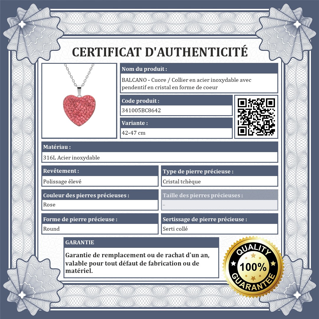 BALCANO - Cuore / Collier en acier inoxydable avec pendentif en cristal en forme de coeur