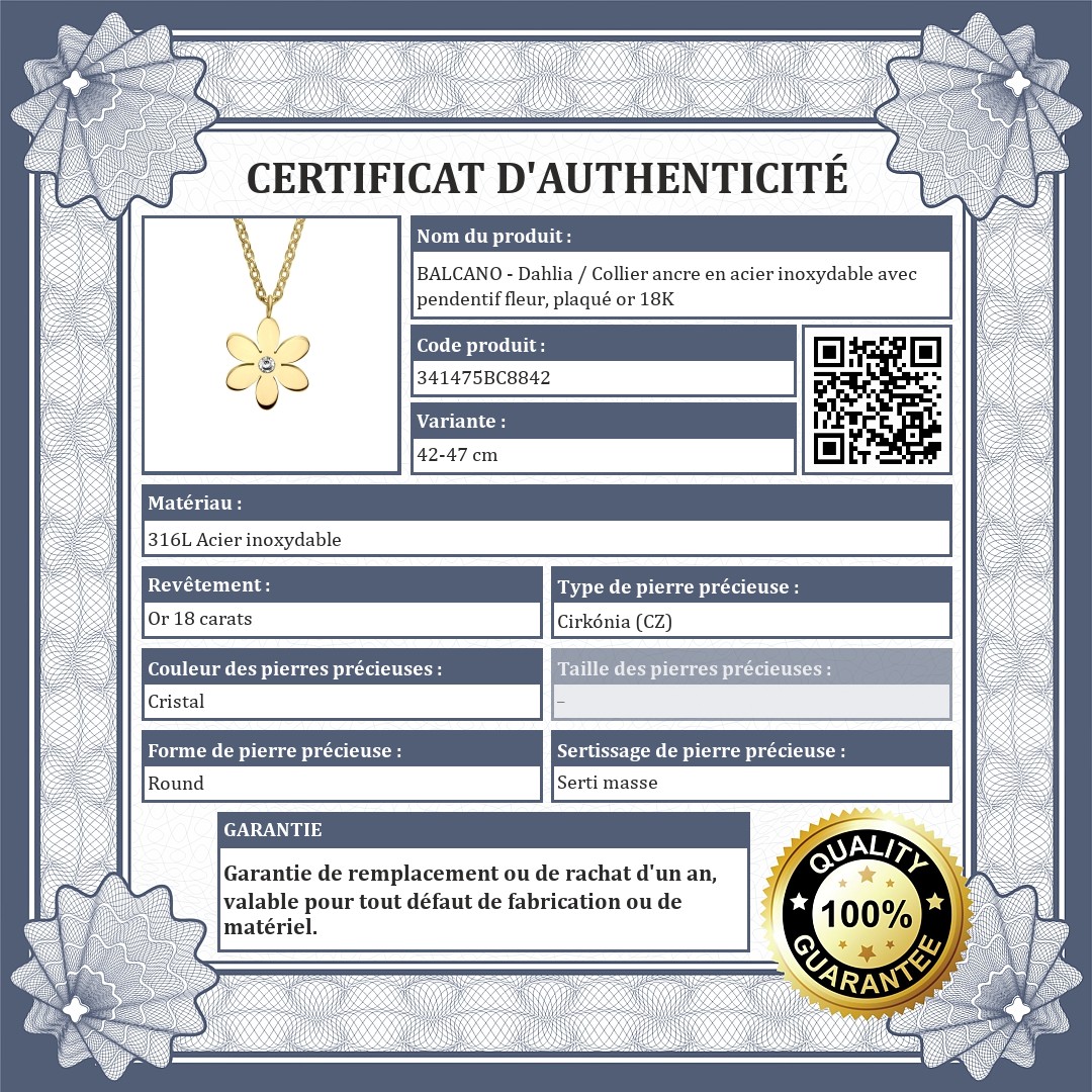 BALCANO - Dahlia / Collier ancre en acier inoxydable avec pendentif fleur, plaqué or 18K