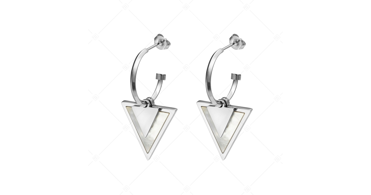 Boucles d'oreilles tendance en acier inoxydable médical 316L, avec hautement polie. Boucles d'oreilles semi-circulaires avec fermoir papillon, ornées de deux formes triangulaires, l'une avec une surface lisse plus petite et l'autre avec une surface perlée plus grande.