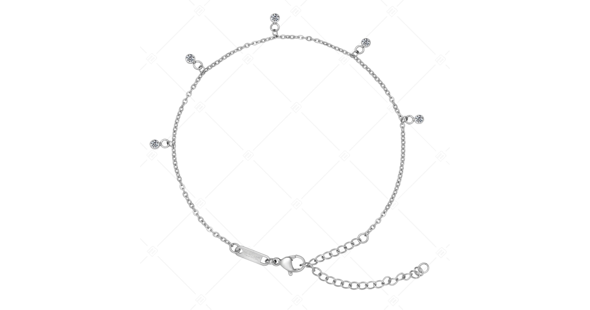 Bracelet de cheville type ancre aplatie avec cristaux ronds de zirconium. Bijoux en acier inoxydable de qualité médicale 316L avec hautement polie. Un accessoire à la mode et élégant, qui, grâce à son matériau hypoallergénique, ne s'use pas et ne se ternit pas à l'usage.