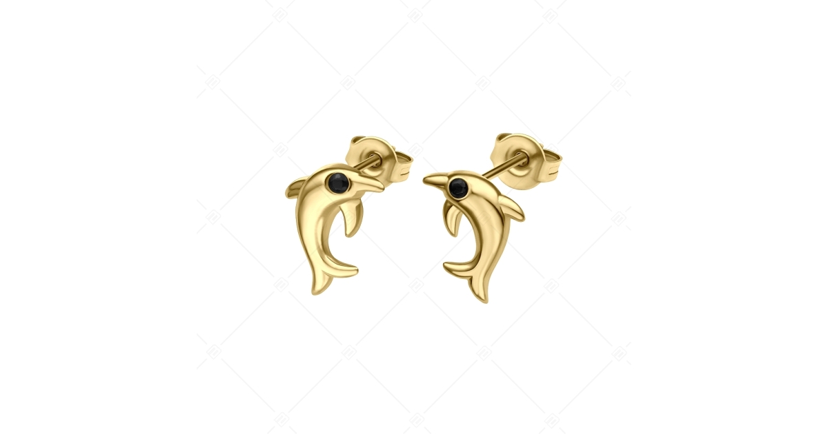 Boucles d'oreilles en forme de dauphin en acier inoxydable 316L, plaqué or 18K et ornées de zircons cubiques noirs. Bijoux hypoallergéniques que tout le monde peut porter en toute sécurité. Grâce à son matériau, il ne se décolore pas, ne s'use pas et n'est pas sensible à l'eau minérale ou aux produits de nettoyage. Un bel accessoire pour tous les jours.