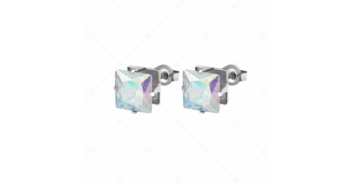 Boucles d'oreilles percées, forme carrée avec des pierres précieuses en zirconium jouant avec les couleurs et la lumière, de 6 mm et 8 mm. Bijoux en acier inoxydable de qualité médicale 316L, qui ne s'usera pas et ne se décolorera pas en raison de son matériau.