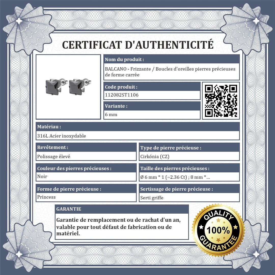 Boucles d'oreilles percées, forme carrée en pierre de zirconium, de couleur noire, en tailles 6 mm et 8 mm. Bijoux en acier inoxydable de qualité médicale 316L, qui, grâce à son matériau, ne s'use pas et ne se décolore pas.