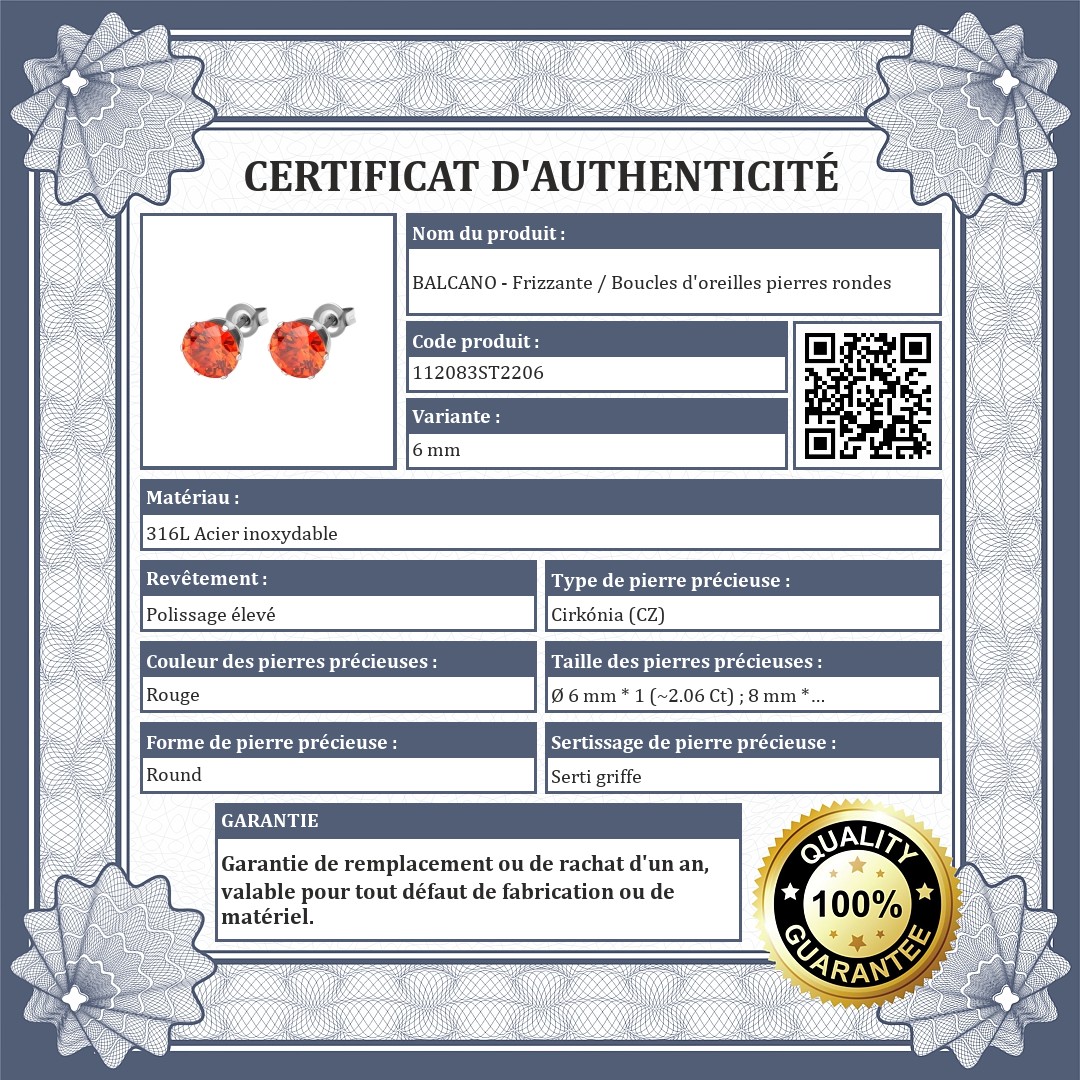 Boucles d'oreille percées avec une pierre précieuse ronde en zirconium, couleur rouge jasmin, en tailles 6 mm et 8 mm. Bijoux en acier inoxydable de qualité médicale 316L, qui, grâce à son matériau, ne s'use pas et ne se décolore pas.