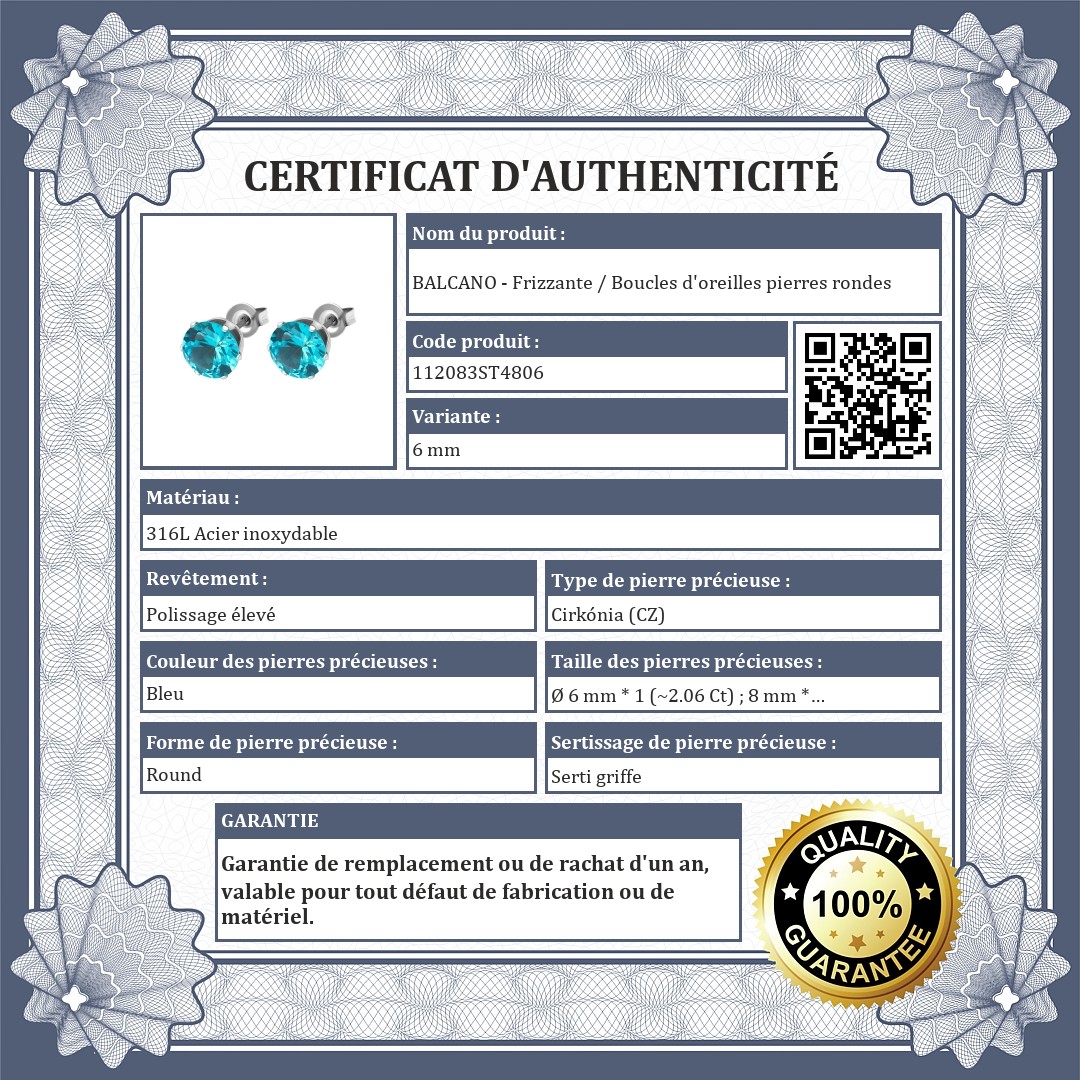 Boucles d'oreille percées avec une pierre précieuse ronde en zirconium, couleur bleu aigue-marine, en tailles 6 mm et 8 mm. Bijoux en acier inoxydable de qualité médicale 316L, qui, grâce à son matériau, ne s'use pas et ne se décolore pas.