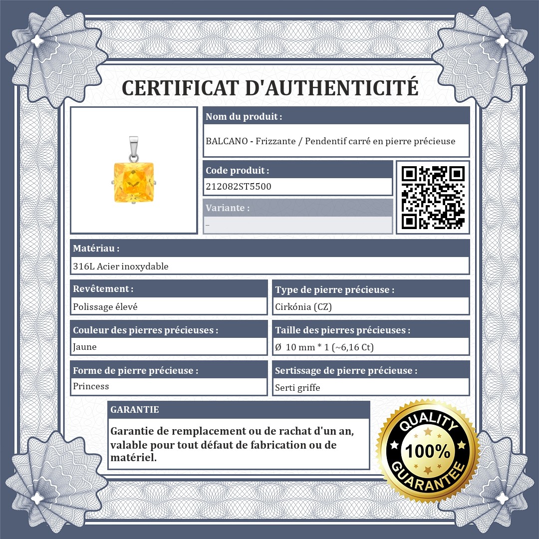 Pendentif carré en pierre de zirconium jaune d'or. Bijoux en acier inoxydable médical 316L, qui, grâce à son matériau, ne s'use pas et ne se décolore pas.