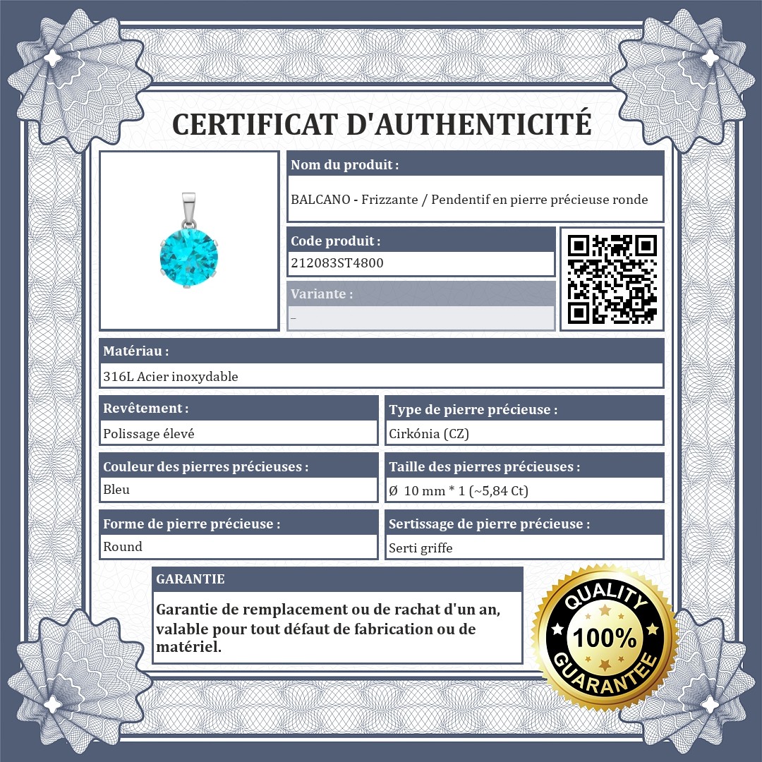 Pendentif en zirconium rond bleu aigue-marine. Bijoux en acier inoxydable de qualité médicale 316L, qui ne s'usera pas et ne se décolorera pas grâce à son matériau.