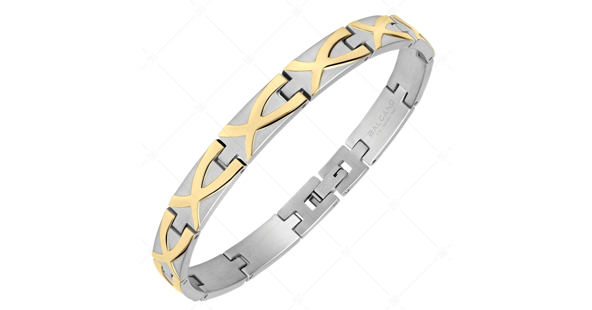 Bracelet unique en acier inoxydable 316L antiallergique avec motif en X arrondi, en partie fileté, surface mate, en partie poli et plaqué or 18K. Le fermoir du bracelet est doté d'un œillet d'insertion qui peut être retiré si nécessaire en cas de taille trop importante. Grâce à son matériau, il ne s'use pas, ne se décolore pas et ne craint pas l'eau. C'est un bijou unique et confortable.