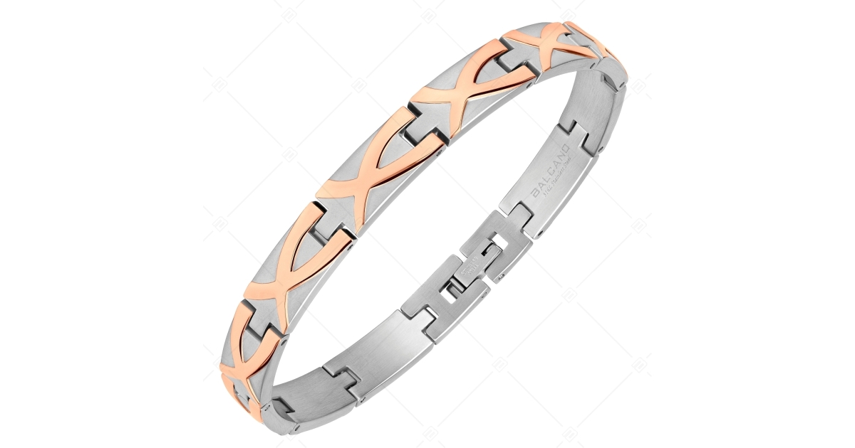 Bracelet unique en acier inoxydable 316L antiallergique avec motif en X arrondi, en partie fileté, surface mate, en partie poli et plaqué or rose 18K. Le fermoir du bracelet est doté d'un œillet d'insertion qui peut être retiré si nécessaire en cas de taille trop importante. Grâce à son matériau, il ne s'use pas, ne se décolore pas et ne craint pas l'eau. C'est un bijou unique et confortable.