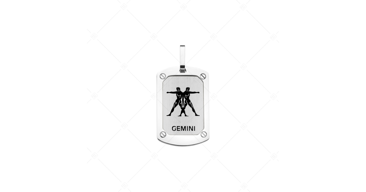 Pendentif horoscope rectangulaire en acier inoxydable, antiallergique, avec l'image du signe zodiaque des Gémeaux. Les bijoux en acier inoxydable médical 316L sont extrêmement durables grâce à leur matériau. Surface filetée, polie, avec le symbole des signes du zodiaque gravé et peint avec hautement polie.