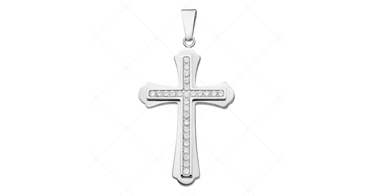 Accessoire élégant et symbolique en acier inoxydable 316L antiallergique. Le pendentif est composé de deux croix, l'une sur l'autre, en argent avec une finition polie à haute brillance. La croix est appelée croix "budded" bourgeonnée en raison de sa forme unique. La croix supérieure, est décorée de magnifiques cristaux de zirconium.