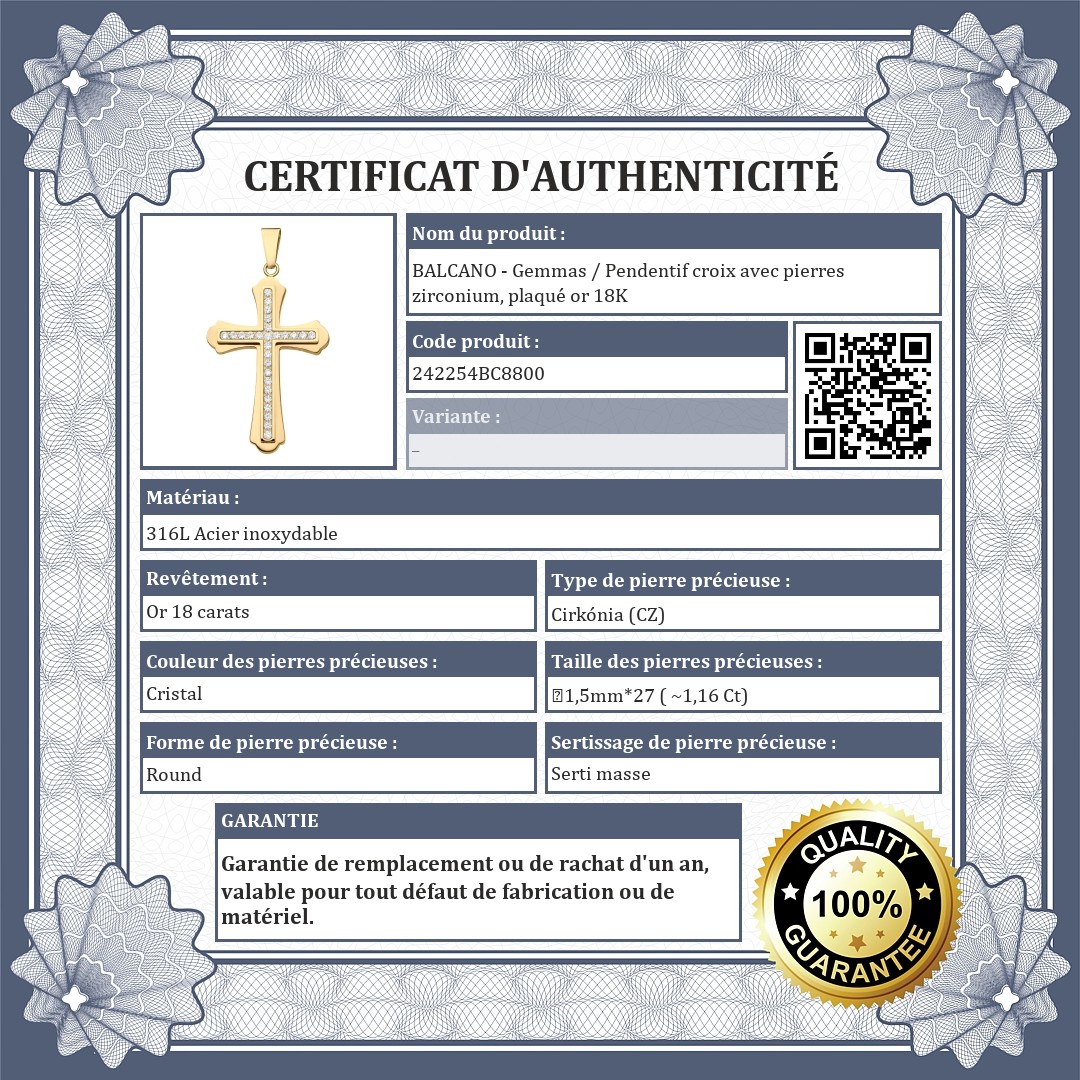 Accessoire élégant et symbolique en acier inoxydable 316L antiallergique. Le pendentif est composé de deux croix superposées, est plaquée en or 18K. La croix est appelée croix "budded" bourgeonnée en raison de sa forme unique. La croix supérieure, est décorée de magnifiques cristaux de zirconium.