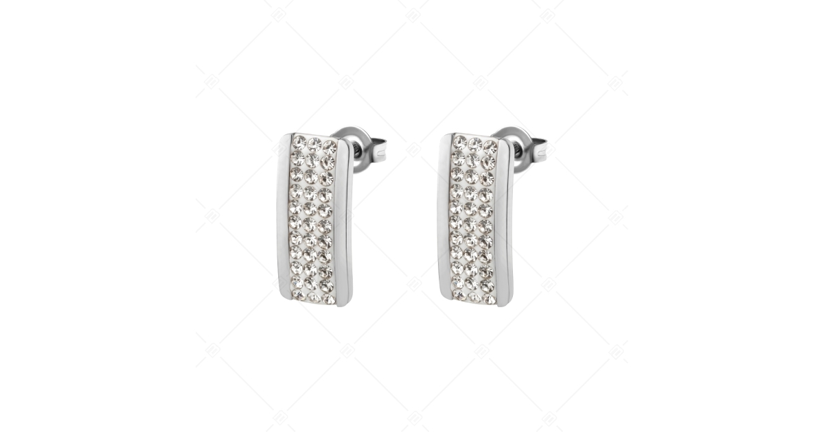Boucles d'oreilles rectangulaires spéciales, rendues encore plus élégantes par les trois rangées de cristaux tchèques clairs étincelants. Bijoux en acier inoxydable 316L avec hautement polie.