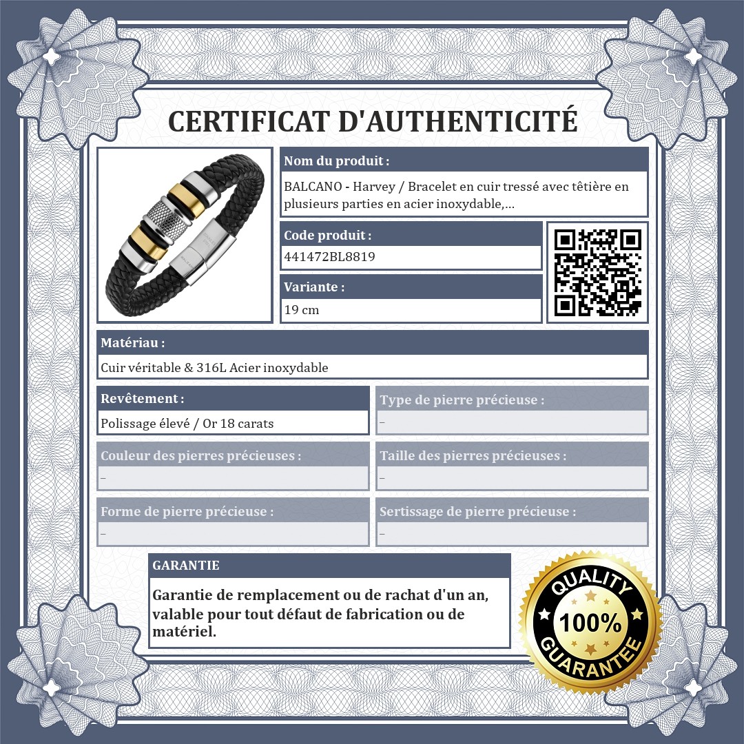 BALCANO - Harvey / Bracelet en cuir tressé avec têtière en plusieurs parties en acier inoxydable, plaqué or 18K
