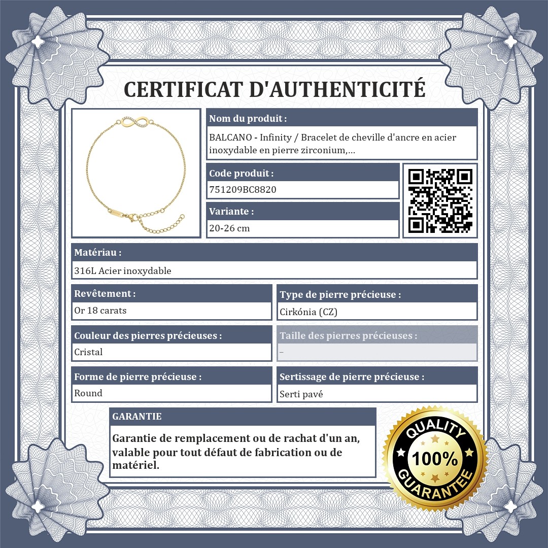 BALCANO - Infinity / Bracelet de cheville d'ancre en acier inoxydable en pierre zirconium, plaqué or 18K