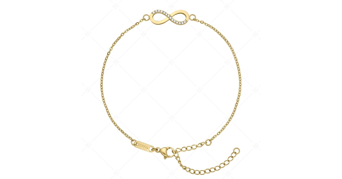 Bracelet de cheville type ancre aplatie avec symbole de l'infini, décoré de minuscules cristaux de zirconium. Bijoux en acier inoxydable de qualité médicale 316L, plaqué or 18K. Un accessoire à la mode et élégant, qui, grâce à son matériau hypoallergénique, ne s'use pas et ne se ternit pas à l'usage.
