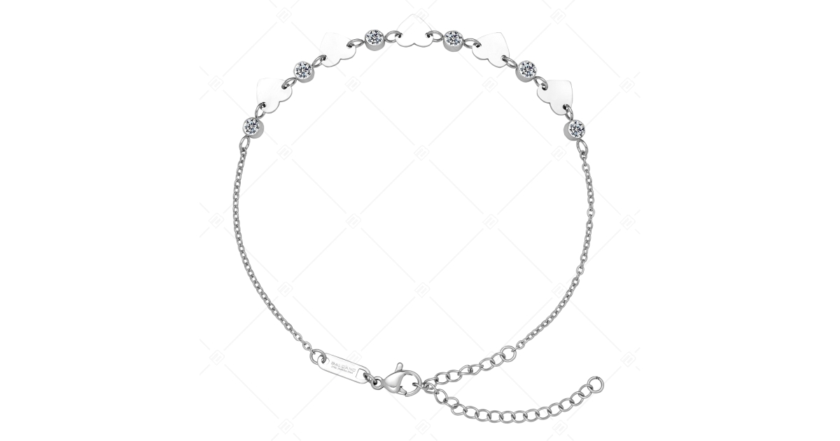 Bracelet de cheville type ancre aplatie avec symbole de petits cœurs, ornée de cristaux ronds de zirconium. Bijoux en acier inoxydable de qualité médicale 316L avec hautement polie. Un accessoire à la mode et élégant, qui, grâce à son matériau hypoallergénique, ne s'use pas et ne se ternit pas à l'usage.