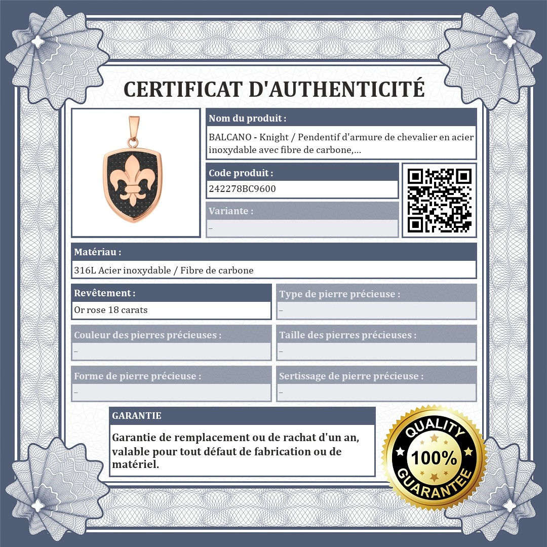 Pendentif en forme d'armure de chevalier avec un motif de lys traditionnel et une incrustation en fibre de carbone. Fabriqué en acier inoxydable médical 316L et plaqué or rose 18K. Un favori des guerriers dans l'âme. Le matériau est hypoallergénique, non abrasif et ne s'effiloche pas.
