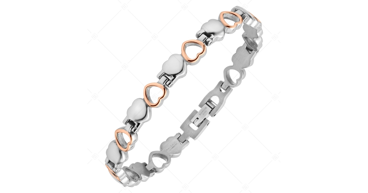 Bracelet en acier précieux pour les éternels romantiques. Bijoux en acier inoxydable médical 316L avec des cœurs plaqué or rose 18K et avec hautement polie.