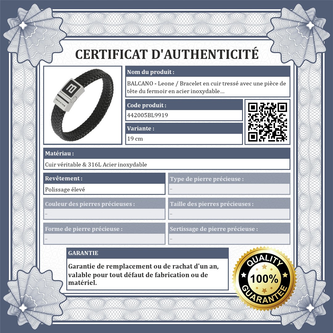 Bracelet en cuir véritable noir, tressé. Avec une pièce de tête en acier inoxydable antiallergique décorée du logo et de l'inscription BALCANO, qui comprend également un fermoir magnétique. Un cadeau classique et propre pour les hommes.
