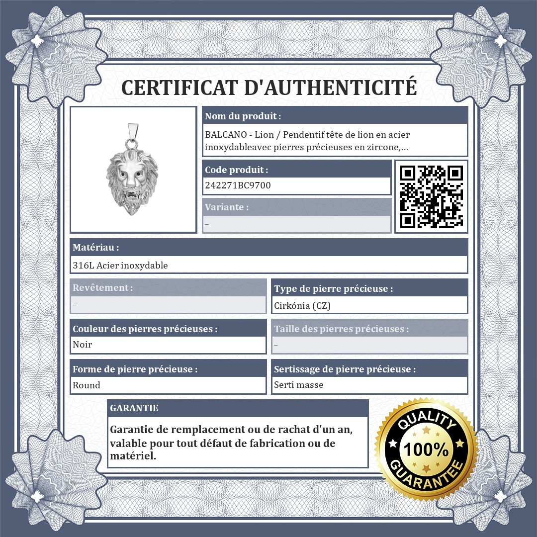 BALCANO - Lion / Pendentif tête de lion en acier inoxydableavec pierres précieuses en zircone, avec hautement polie