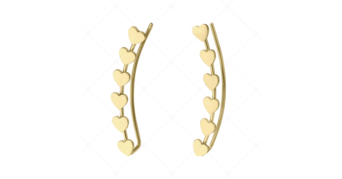 Boucles d'oreilles à la mode qui s'adaptent à la courbe de l'oreille et sont décorées d'une rangée de petits cœurs. Acier inoxydable médical 316L, acier inoxydable antiallergique, fini avec un plaqué or 18K chatoyant.