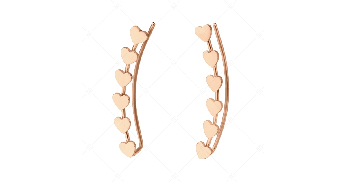 Boucles d'oreilles à la mode qui s'adaptent à la courbe de l'oreille et sont décorées d'une rangée de petits cœurs. Acier inoxydable médical 316L, acier inoxydable antiallergique, fini avec un plaqué dor rose 18K chatoyant.
