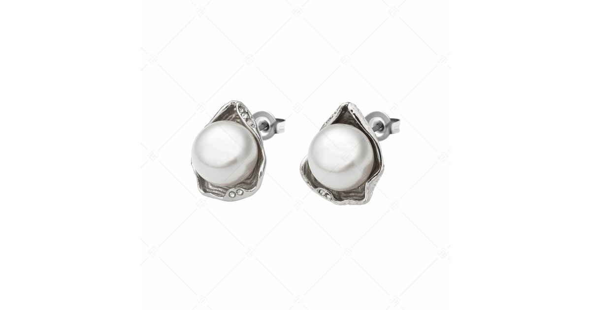 Boucles d'oreilles percées en forme de coquillage avec d'élégantes perles blanches et des pierres précieuses en zirconium. Bijoux en acier inoxydable médical 316L avec une finition argentée hautement polie.