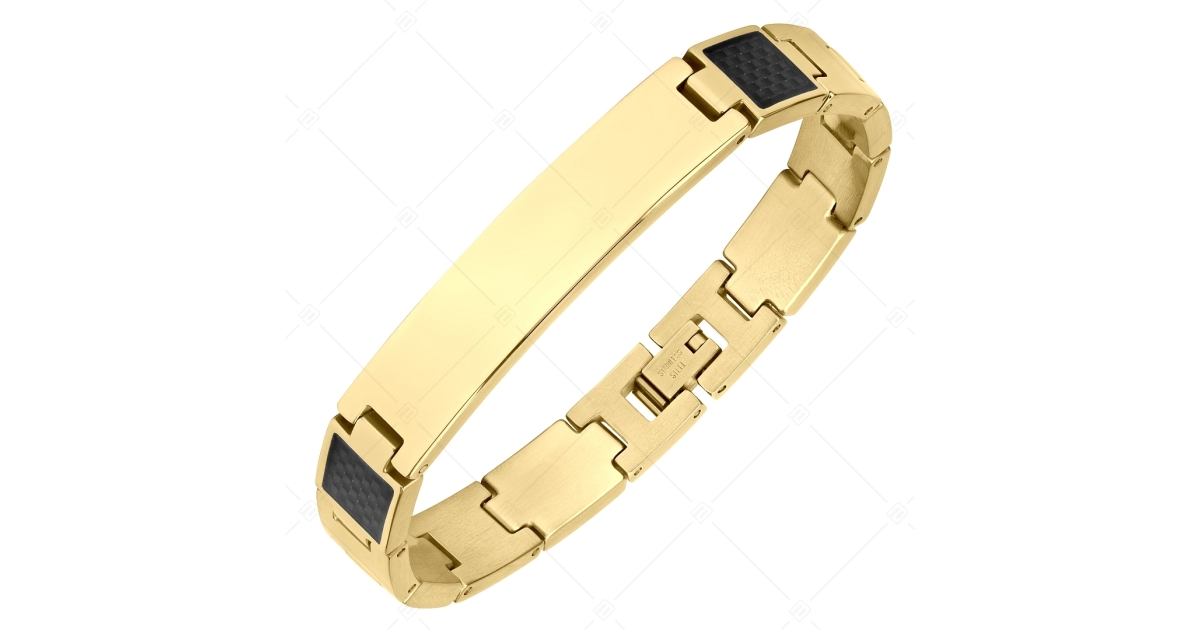 Bracelet gravable en acier inoxydable poli et plaqué or 18K. Décoré d'une incrustation en fibre de carbone noire. Le fermoir du bracelet est doté d'un anneau d'insertion qui peut être retiré si la taille est trop grande. Grâce à son matériau, il ne s'use pas, ne se décolore pas et ne craint pas l'eau. C'est un bijou unique et confortable.