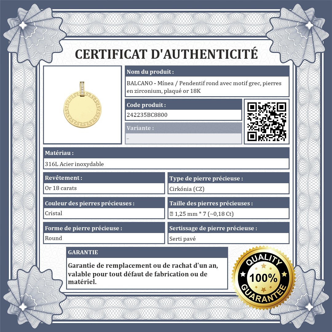 BALCANO - Mínea / Pendentif rond avec motif grec, pierres en zirconium, plaqué or 18K