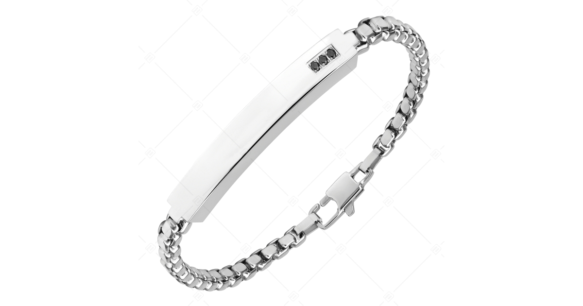 Bracelet en acier inoxydable avec maillons arrondis en cubes vénitiens et tête incurvée gravable. Le bijou est fabriqué en acier inoxydable médical 316L hautement poli. Il est orné de 3 pierres rondes en zircone cubique noire. Grâce à son matériau, il ne s'usera pas, ne se décolorera pas et ne sera pas endommagé par l'eau.